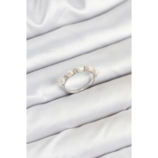 Mey İthalat® Pirinç Gümüş Renk Sıralı İncili Kadın Yüzük