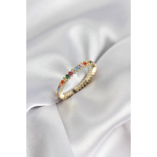 Mey İthalat® Sıralı Karışık Renkli Gold Renk Zirkon Taşlı Kadın Yüzük