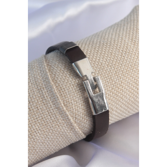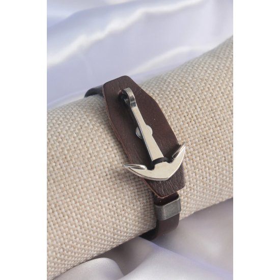 Mey İthalat® Kahverengi Deri Model Gümüş Renk Çapa Figür Erkek Bileklik