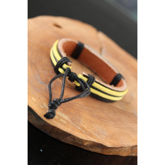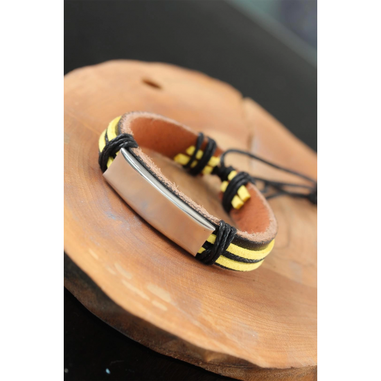 Mey İthalat® Metal Aksesuarlı Sarı Siyah Renk Deri Erkek Bileklik
