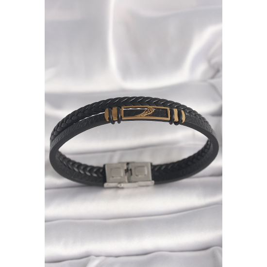 Mey İthalat® 316L Çelik Gold Renk Kanat Aksesuarlı Siyah Burgu Model Deri Kordon Erkek Bileklik