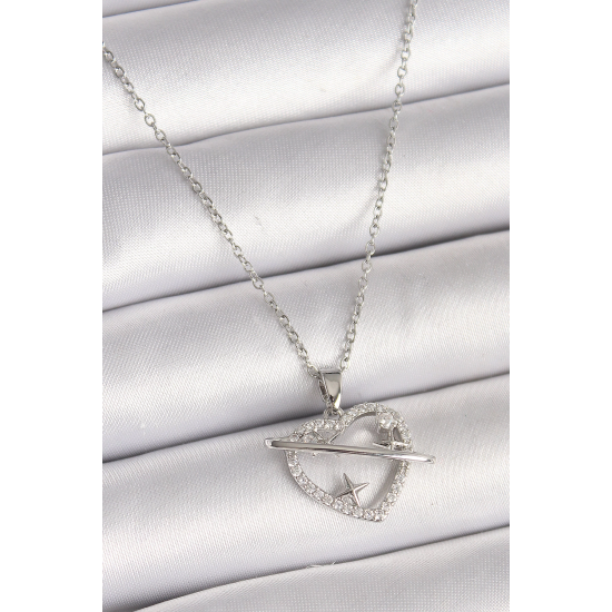 Mey İthalat® 316L Çelik Gümüş Renk Zincir Zirkon Taşlı Kalp Model Yıldız Detay Kadın Kolye