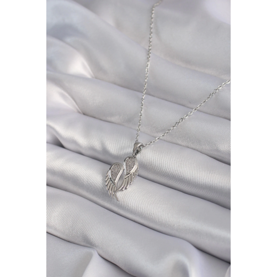 Mey İthalat® 316L Çelik Gümüş Renk Zirkon Taşlı Kanat Model Kadın Kolye