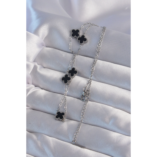 Mey İthalat® 316L Çelik Gümüş Renk Minimal Siyah Mineli Yonca Kolye