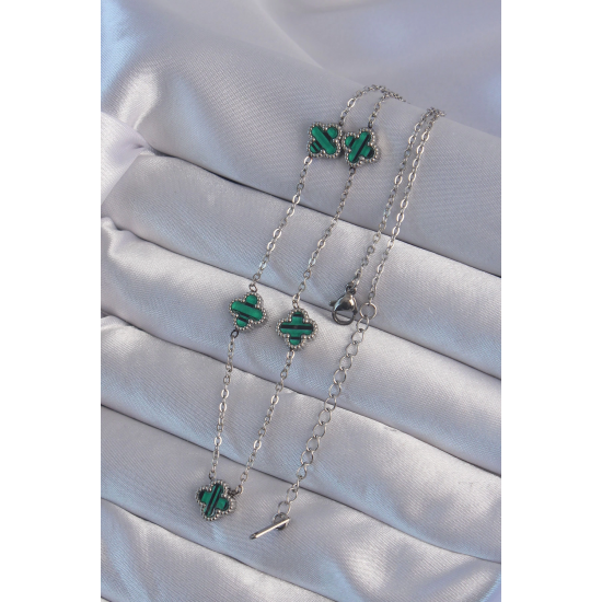 Mey İthalat® 316L Çelik Gümüş Renk Minimal Yeşil Mineli Yonca Kolye