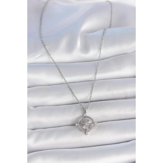 Mey İthalat® 316L Çelik Gümüş Renk Zincir Zirkon Taşlı Pusula Model Kadın Kolye