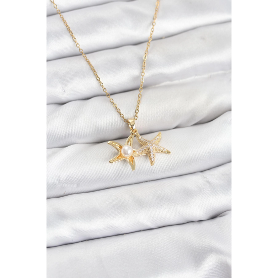 Mey İthalat® 316L Çelik Zincir Gold Renk Deniz Yıldızı Model Zirkon Taşlı Kadın Kolye