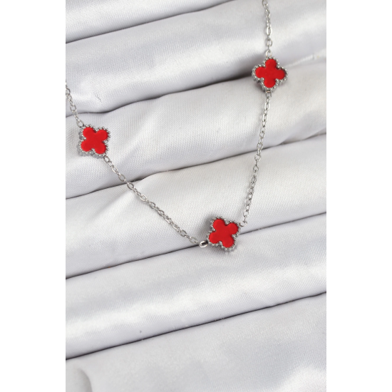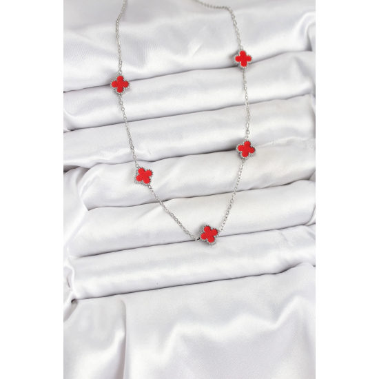 Mey İthalat® 316L Çelik Zincir Gümüş Renk Kırmızı Baby Boy Yonca Kadın Kolye
