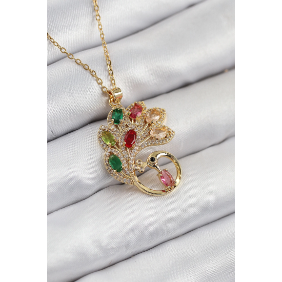 Mey İthalat® 316L Çelik Zirkon Taşlı Tavus Kuşu Model Gold Renk Kadın Kolye