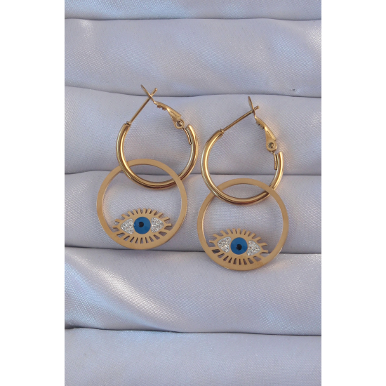 Mey İthalat® 316L Çelik Gold Renk Zirkon Taşlı Mavi Göz Tasarımlı Halka Küpe
