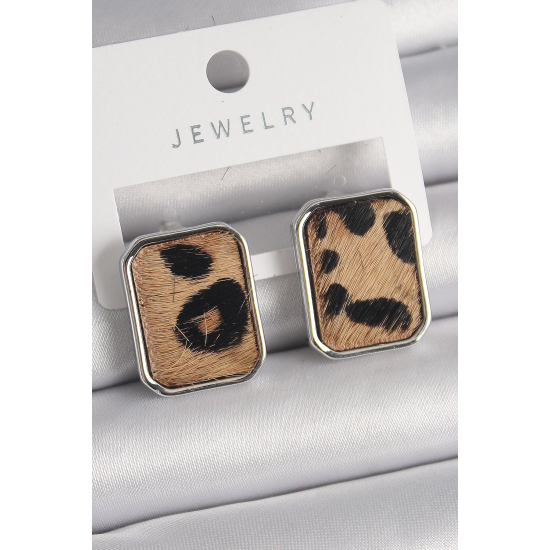 Mey İthalat® Pirinç Gümüş Renk Leopar Desenli Kare Model Kadın Küpe