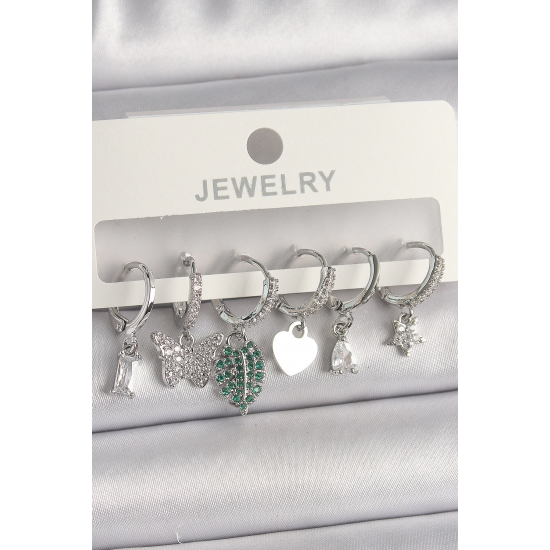 Mey İthalat® Pirinç Gümüş Renk Zirkon Taşlı Çoklu Figür Kadın Küpe Seti