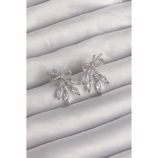 Mey İthalat® Pirinç Gümüş Renk Zirkon Taşlı Fiyonk Küpe