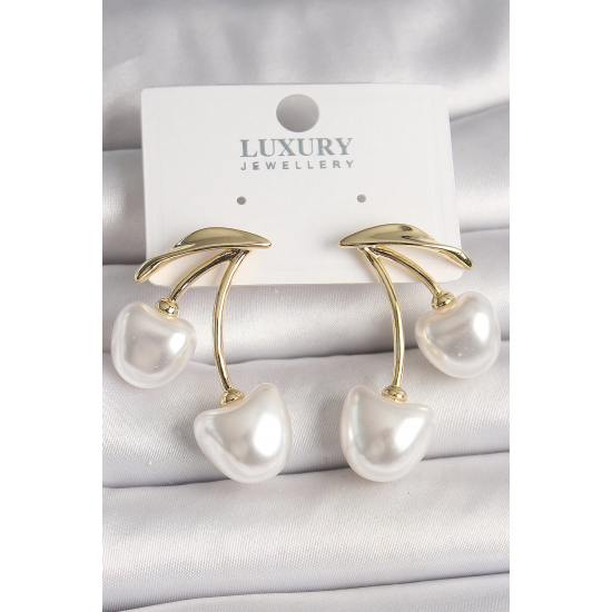 Mey İthalat® Pirinç Gold Renk Beyaz İnci Kiraz Model Kadın Küpe