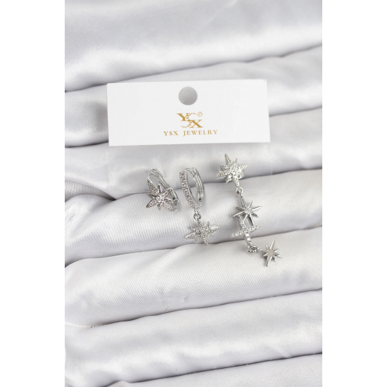 Mey İthalat® Pirinç Gümüş Renk Zirkon Taşlı Kutup Yıldızı Model YSX Trio Küpe Seti