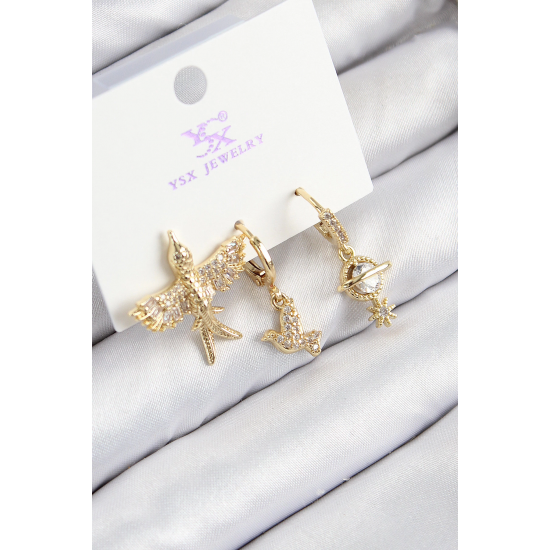 Mey İthalat® Pirinç Zirkon Taşlı 3'lü Kuş Model Gold Renk Kadın Küpe
