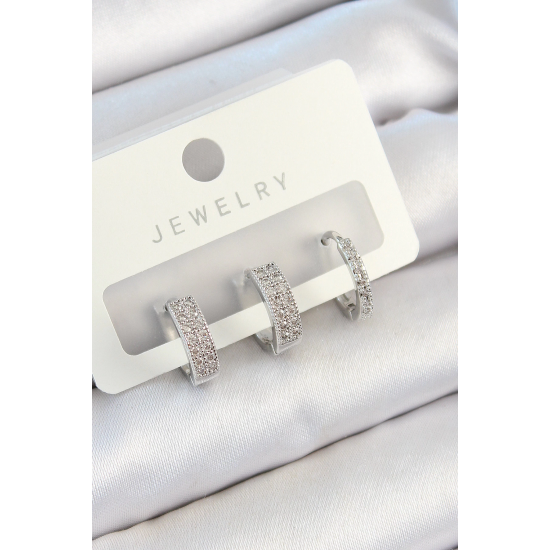 Mey İthalat® Pirinç Zirkon Taşlı Halka Model Gümüş Renk 3'lü Çift Kadın Küpe Set