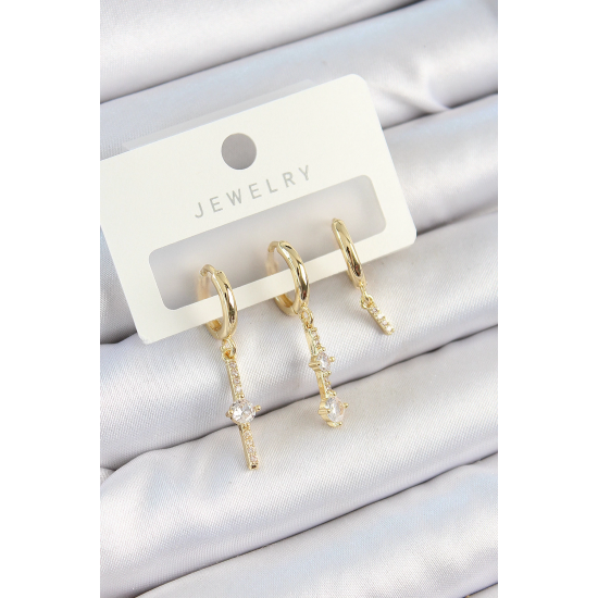 Mey İthalat® Pirinç Zirkon Taşlı Sallantılı Model Gold Renk 3'lü Çift Kadın Küpe Set