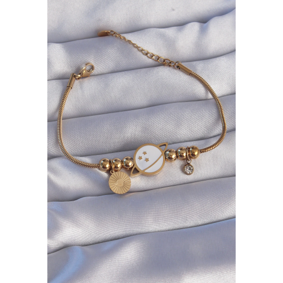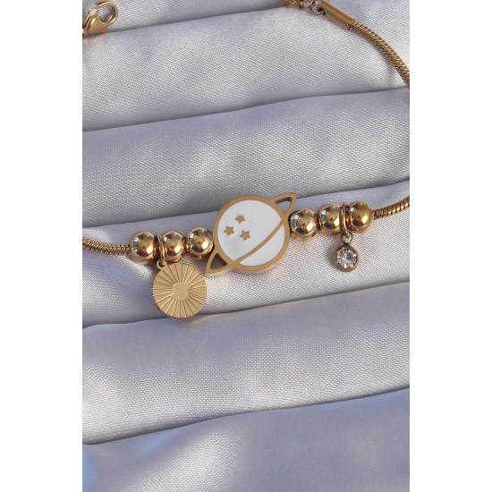 Mey İthalat® 316L Çelik Gold Renk Zirkon Taşlı Mineli Satürn Tasarımlı Bileklik