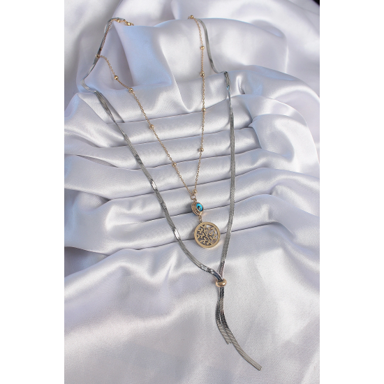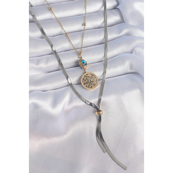 Mey İthalat® 316L Çelik Mix Renk Filiz Figür Nazar Boncuk Detay Uzun Kadın Kolye