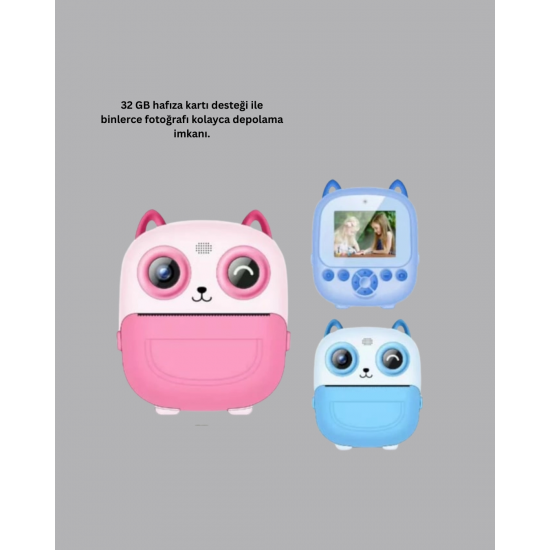 Bu anında baskı dijital kamera, çocukların eğlence dünyasına yepyeni bir boyut katıyor. 2.4 inç ekranı ile çekilen fotoğraflar net şekilde görülebilirken, 48MP kamera ve 1080P video kayıt özellikleri sayesinde kaliteli çekimler yapılabilir. 6X dijital yakınlaştırma fonksiyonu, uzak nesneleri dahi detaylı olarak kaydetmeye imkan verir. Fotoğraf çekildikten sonra, entegre edilmiş termal yazıcı ile baskı alınabilir. Mürekkep gerektirmemesi, kullanım maliyetini düşürür ve daha hijyenik bir deneyim sunar. Çocuklar için özel hazırlanmış eğlenceli oyunlar ve müzik oynatma özelliği, cihazı sadece bir kamera değil aynı zamanda bir eğlence merkezi haline getirir. 1300mAh bataryası uzun süre kullanım sunar ve Type-C şarj desteği ile kolayca şarj edilebilir. 32 GB’a kadar hafıza kartı desteği ile binlerce fotoğraf saklanabilir.