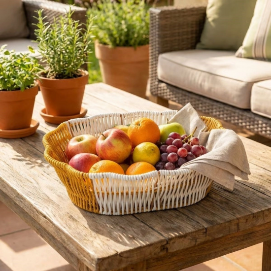 Oval Çift Renkli Plastik Rattan Ekmek ve Meyve Sepeti, doğal hasır görünümünü modern ve dayanıklı plastik malzeme ile birleştirerek yaşam alanlarınıza şıklık ve düzen kazandırır. Çift renkli tasarımı sayesinde hem mutfak hem de banyo dekorasyonuna kolayca uyum sağlar.
