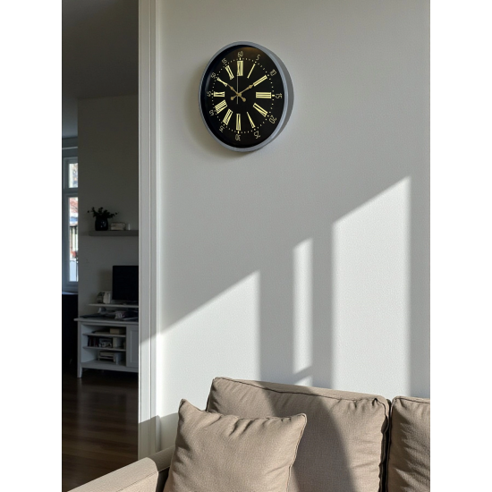 Modern ve şık dekorasyonu bir arada sunan 36 cm Gri Renk Duvar Saati, sade tasarımı ve gri-metal çerçevesiyle hem modern hem endüstriyel dekorasyon tarzlarına mükemmel uyum sağlar. Siyah arka plan üzerinde kullanılan altın tonlu Roma rakamları, saatin tasarımına lüks bir dokunuş katar ve bulunduğu ortamın estetik değerini artırır.