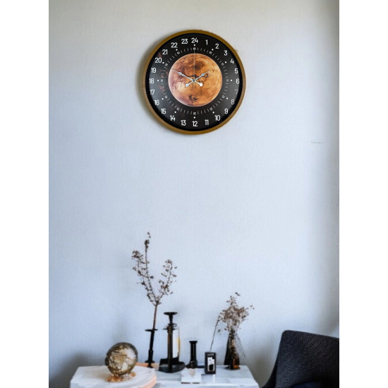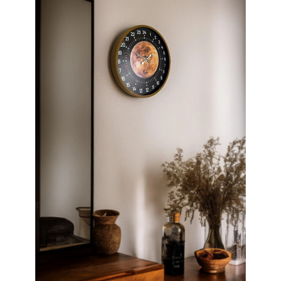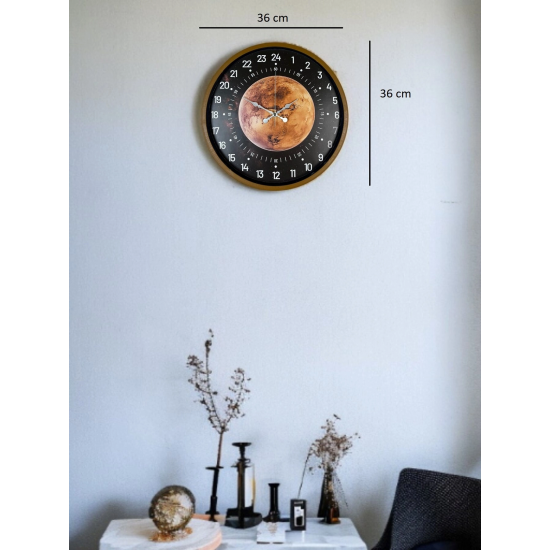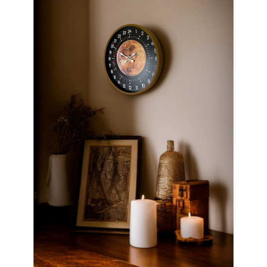 Klasik duvar saatlerinden farklı olarak 24 saatlik zaman dilimiyle çalışan özel kadran tasarımına sahip olan bu 36 cm duvar saati, zamanı alışılmışın dışında ve daha detaylı bir şekilde takip etmenizi sağlar. Kahverengi çerçevesi, koyu zemin üzerindeki gezegen temalı tasarımı ve net beyaz rakamlarıyla dikkat çeken bu model; hem dekoratif hem de fonksiyonel bir üründür.