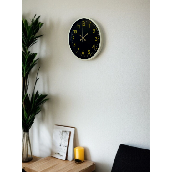 Krem renkli çerçevesi ile koyu zemin üzerindeki gold tonlu rakamları ve zarif akrep-yelkovan tasarımı sayesinde bu 36 cm duvar saati, bulunduğu ortama klasik ve sofistike bir hava katar. Net ve dengeli kadran yapısı, saatin her açıdan rahatlıkla okunmasını sağlar. Hem modern hem de klasik dekorasyon stilleriyle uyumlu, zamansız bir tasarıma sahiptir.