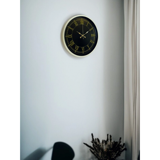 Krem renkli çerçevesi, siyah kadranı ve gold tonlu Roma rakamları ile tasarlanan bu 36 cm duvar saati; klasik dekorasyon sevenler için zamansız ve asil bir görünüm sunar. Detaylı dakika göstergeleri ve dengeli kadran yapısı sayesinde zamanı kolayca okumayı sağlar. Salon, oturma odası ve ofis gibi yaşam alanlarında dekorasyonu tamamlayan güçlü bir aksesuardır.