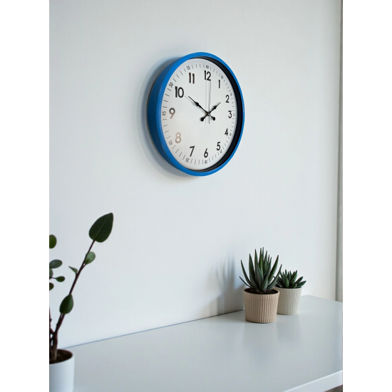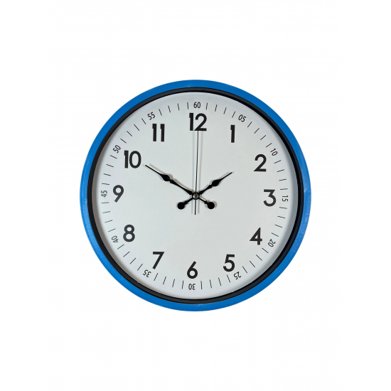 ÜRÜN AÇIKLAMASI Modern tasarımın enerjik renklerle buluştuğu bu 36 cm mavi duvar saati, ev ve ofis dekorasyonuna canlılık katmak isteyenler için ideal bir tercihtir.; Mavi çerçevesiyle ortama taze ve dinamik bir hava katan bu saat; sade beyaz kadranı, büyük siyah rakamları ve detaylı dakika göstergeleri (05, 10, 15..; ) ile yüksek okunabilirlik sunar.; Hem dekoratif hem fonksiyonel bir saat arayanlar için mükemmel bir üründür.; Saatin ön yüzeyinde kullanılan gerçek cam, uzun ömürlü kullanımın en önemli garantisidir.; Gerçek cam; plastik camlara göre çok daha dayanıklı olup çizilmeye karşı yüksek direnç sağlar, ışığı doğru kırarak kadranın her açıdan net görünmesini mümkün kılar.; Zamanla sararma veya matlaşma yapmadığı için ürün yıllarca premium görünümünü korur.; Temizliği ise son derece kolaydır.; Sessiz çalışan akar saniye (sweep) mekanizması, tıkırtı sesi olmadan akıcı bir hareket sağlar.; Bu özelliği sayesinde saat; yatak odası, ofis, çalışma odası, mutfak, kütüphane, çocuk odası ve sessizliğin önemli olduğu tüm yaşam alanları için uygundur.; Uzun süreli kullanımlarda bile rahatsızlık vermez.; Dayanıklı ve hafif plastik gövdesi kolayca monte edilebilir.; Canlı mavi çerçevesi; modern, genç, enerjik ve minimalist dekorasyon tarzlarıyla mükemmel bir uyum sağlar.; Ev dekorunda renkli bir tamamlayıcı arayanlar için oldukça ideal bir modeldir.;