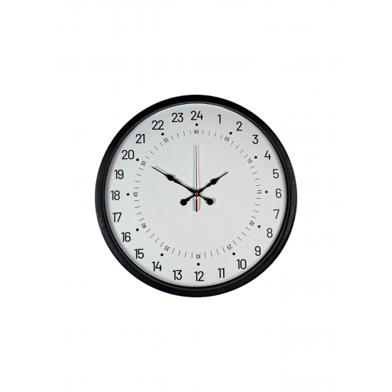 Standart 12 saatlik sistemden farklı olarak 24 saatlik zaman düzenine göre tasarlanan bu 36 cm siyah duvar saati, zamanı tek turda ve daha net bir şekilde takip etme imkânı sunar. Beyaz kadranı üzerinde yer alan 1–24 arası rakamlar sayesinde günün tüm saatleri kolayca ayırt edilir.