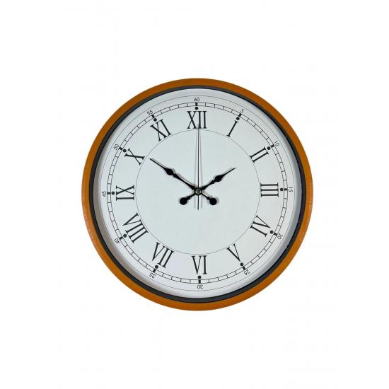 Canlı turuncu çerçevesiyle dikkat çeken bu 36 cm duvar saati, klasik Roma rakamlı kadran tasarımıyla zamansız bir şıklık sunar. Beyaz zemin üzerine yerleştirilen siyah Roma rakamları, saatin okunurluğunu artırırken dekorasyona güçlü bir karakter kazandırır.