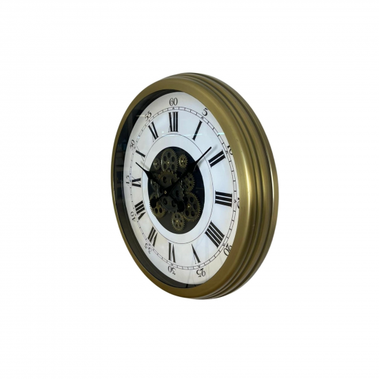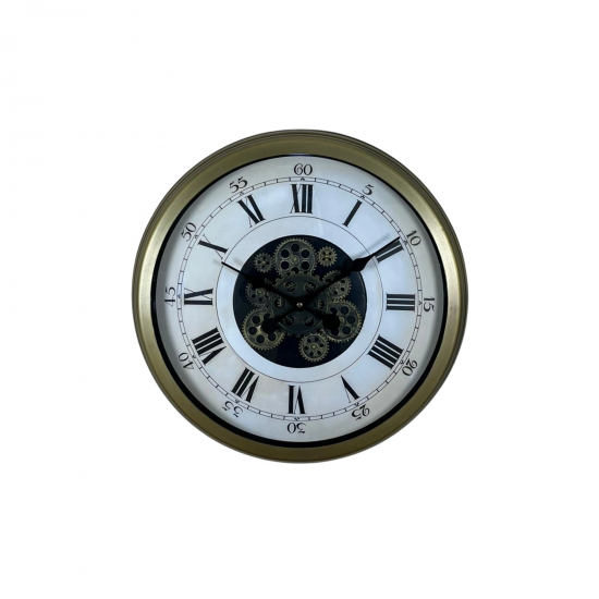 Merkezde konumlanan dekoratif hareketli çark mekanizması, saatin klasik görünümüne mekanik ve karakterli bir dokunuş katar. 60 cm geniş çapı sayesinde özellikle büyük duvarlarda etkileyici ve dengeli bir duruş sağlar.