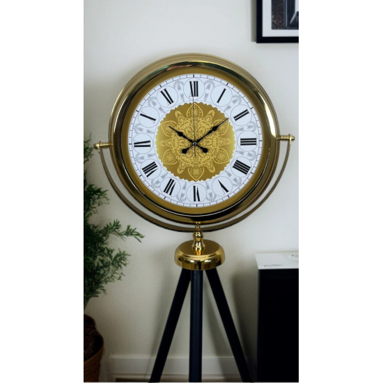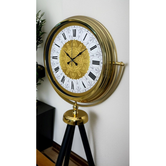 Sanatsal detayları ve zarif duruşuyla öne çıkan bu gold tripod ayaklı yer saati, klasik estetiği modern çizgilerle birleştirerek yaşam alanlarına güçlü bir karakter kazandırır. Saat kadranının merkezinde yer alan altın motifli desen, ürüne dekoratif bir derinlik ve sofistike bir görünüm sunar. Roma rakamlı göstergeler, klasik saat anlayışını yansıtırken; gold çerçeve ile bütünleşerek zamansız bir şıklık oluşturur.