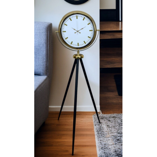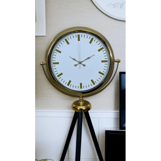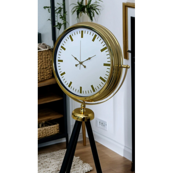 Zamansız tasarımı ve modern çizgileri bir araya getiren Gold Tripod Ayaklı Saat, bulunduğu ortama güçlü bir duruş ve sofistike bir şıklık kazandırır. Gold renkli metal kasası, sade beyaz kadranı ve siyah tripod ayaklarıyla hem klasik hem de modern dekorasyon stilleriyle kusursuz uyum sağlar. Geniş ölçüleri sayesinde yalnızca bir saat değil, aynı zamanda dekoratif bir odak noktası olarak mekânda fark yaratır.