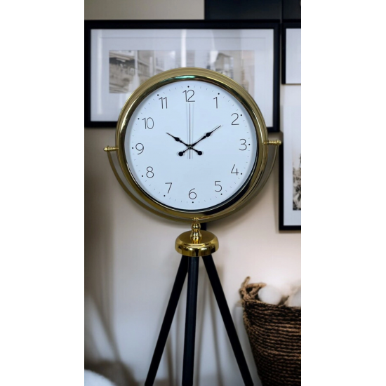 Gold renkli metal çerçevesi, beyaz kadranı ve siyah tripod ayakları ile dengeli ve sofistike bir görünüm sunar. Gerçek cam kadranı, ürüne hem üst segment kalite hissi hem de uzun ömürlü kullanım sağlar. Büyük ölçüsü sayesinde tek başına dekoru tamamlayan, güçlü bir odak noktası oluşturur.