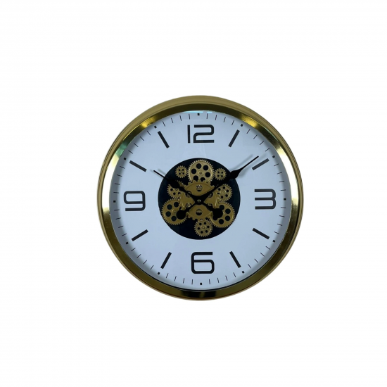 Parlak gold metal çerçevesi, sade beyaz kadranı ve merkezde yer alan altın tonlu hareketli çark mekanizması ile tasarlanan bu 60 cm duvar saati; modern yaşam alanlarına şıklık ve prestij katar.