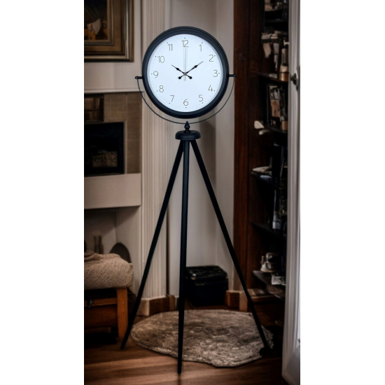 Üç ayaklı tripod formu, saate hem dekoratif hem de mimari bir karakter kazandırır. Dengeli ayak yapısı sayesinde zeminde sağlam durur, güvenli kullanım sağlar. Siyah metal gövdesi, modern ve endüstriyel dekorasyon tarzlarıyla mükemmel uyum sağlarken; klasik mekânlarda da şık bir kontrast oluşturur.