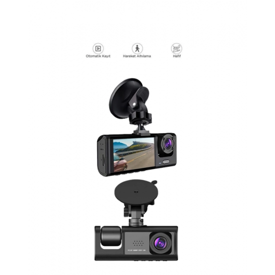 Bu gelişmiş 3 kameralı araç içi kamera sistemi, sürüş sırasında maksimum güvenliği sağlamak için özel olarak tasarlanmıştır. Ön kameradaki 1080p Full HD çözünürlük ile yoldaki tüm detayları yüksek netlikte görebilir, iç ve arka kameralarla da aracınızın her yönünü eş zamanlı kaydedebilirsiniz. 170° geniş açılı lens, kör noktaları azaltır ve her açıdan görüş sağlar. İç kamerayla yolcu hareketlerini izleyebilir, arka kamerayla park sırasında ekstra destek alabilirsiniz. Gece görüş desteği sayesinde loş ortamlarda dahi kayıt kalitesi düşmez. 2.0 inç LCD ekran üzerinden anlık izleme ve menü kontrolü sağlanabilir. Gelişmiş G-sensör ve hareket algılama özellikleri, ani darbeleri veya park halindeyken gerçekleşen olayları otomatik olarak kaydeder. Suya ve toza dayanıklı tasarımı sayesinde her hava koşulunda güvenle kullanılabilir.