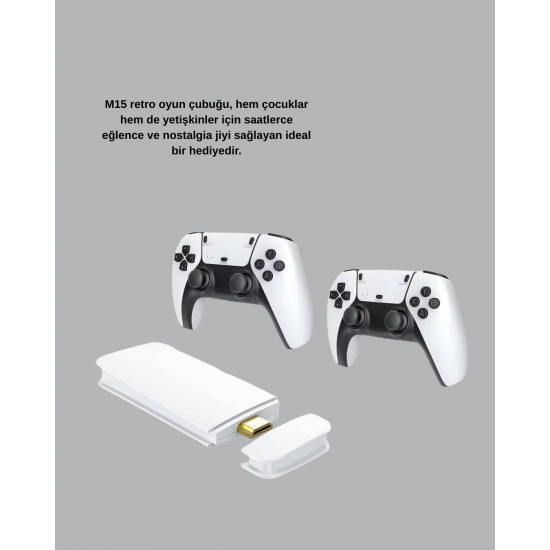 M15 oyun çubuğu, eski ve yeni oyuncular için özel olarak geliştirilmiş, 20.000 oyunlu nostalji dolu bir konsoldur. Dört çekirdekli işlemcisi ve 64GB belleği ile hızlı ve kararlı performans sunar. 20 farklı oyun platformunun en iyi başlıklarını içinde barındırır.Kurulumu son derece basittir: cihazı güç kaynağına bağlayın, HDMI kablo ile televizyona takın ve oyunlar başlasın! Kablosuz kontrolcüler sayesinde oyun sırasında rahatça hareket edebilirsiniz. Çocuklar için sade, yetişkinler için nostaljik bir deneyim sağlar.Kompakt boyutu sayesinde taşıması kolaydır. Oyun sırasında yüksek performans isteyen kullanıcılar için optimize edilmiştir. Tek yapmanız gereken fişe takmak ve eğlencenin keyfini sürmek.