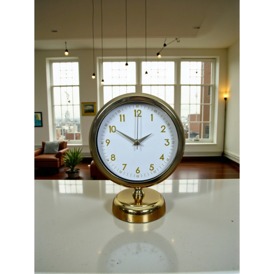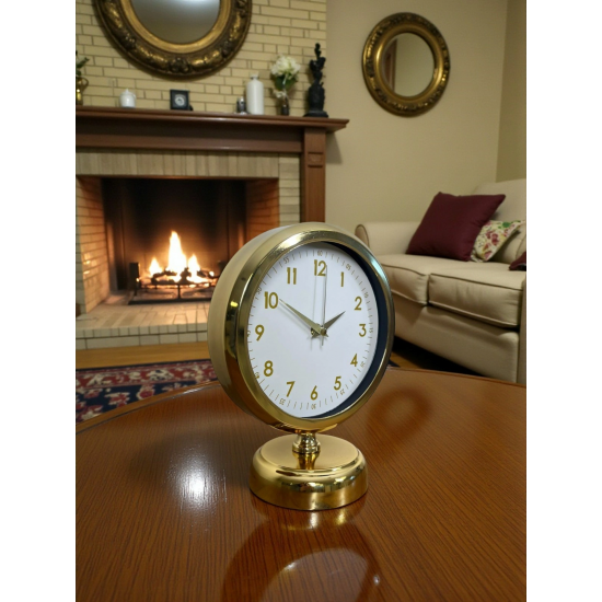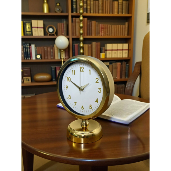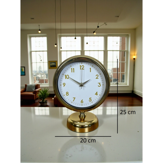 Minimal çizgileri ve klasik tasarımı bir araya getiren bu gold masa saati, beyaz kadranı ve gold detaylarıyla bulunduğu her ortama ferah, şık ve düzenli bir görünüm kazandırır. Gözü yormayan sade tasarımı sayesinde hem modern hem de klasik dekorasyonlarla rahatlıkla uyum sağlar. Çalışma masasında, salon konsolunda ya da ofis ortamında dekoru tamamlayan zarif bir aksesuar olarak öne çıkar.