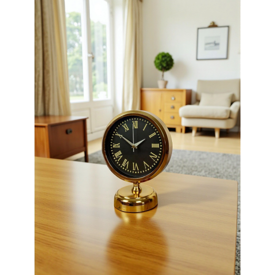 Klasik zarafeti modern detaylarla buluşturan GOLD 25 x 20 cm masa saati, siyah kadranı ve gold metal gövdesiyle bulunduğu her ortamda güçlü ve prestijli bir duruş sergiler. Roma rakamlı kadran tasarımı, saate nostaljik bir karakter kazandırırken siyah–gold kontrastı sayesinde lüks ve dikkat çekici bir görünüm sunar. Ofis masaları, salon konsolları, çalışma odaları ve vitrinler için dekoratif bir tamamlayıcıdır.