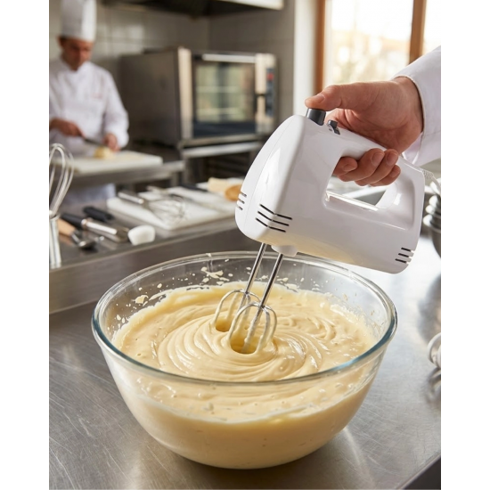 Mutfakta pratik ve hızlı hazırlık yapmak isteyen kullanıcılar için tasarlanmış olan el mikseri, güçlü motoru ve kullanışlı tasarımı sayesinde günlük mutfak işlerini kolaylaştırır.250W gücündeki motor sistemi sayesinde kek hamuru, krema ve sos gibi birçok karışım kısa sürede hazırlanabilir.5 kademe hız ayarı sayesinde farklı tariflere uygun hız seçenekleri sunar.Paslanmaz çelik çırpma aparatları dayanıklı yapısı sayesinde uzun süreli kullanım sağlar.Aksesuar çıkarma düğmesi aparatların kolay şekilde çıkarılmasını sağlar ve temizlik işlemini kolaylaştırır.Ergonomik tasarımı sayesinde elde rahat bir kullanım sunar.