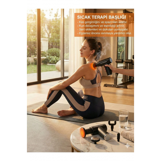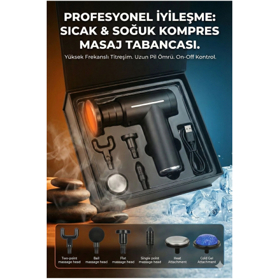 Kas Ağrılarına ve Yorgunluğa Son Verin! Gün boyu masa başında mı çalışıyorsunuz yoksa ağır antrenmanlar mı yapıyorsunuz? İhtiyacınız olan tam profesyonel bakım bu kutunun içinde.; Hem ısıtarak gevşeten hem de soğuk etkisiyle ağrıyı dindiren bu set ile yaşam kalitenizi artırın.; Neden Bu Ürünü Seçmelisiniz? * Çift Etkili Terapi: Sadece titreşim değil, termal etki ile masaj deneyimini ikiye katlar.; * Derin Doku Masajı: Yüksek frekanslı vuruşları ile kasın en derinine inerek gerginliği alır.; * Kişiselleştirilebilir Hız: Hassas bölgelerden sert kas gruplarına kadar ayarlanabilir hız seviyeleri.; * Ergonomik Tasarım: Tek elle kolay kullanım sağlayan, kaymaz ve terletmez tutuş yüzeyi.; * Taşınabilir Güç: Uzun pil ömrü ve Type-C şarj kolaylığı ile spor salonuna veya seyahate götürün.; Başlıkların Kullanım Alanları: 1. Top Başlık: Büyük kas grupları (Kol, bel, kalça, bacak).; 2. U (Çatal) Başlık: Boyun, omurga ve aşil tendonu çevresi.; 3. Mermi (Tek Nokta) Başlık: Tetik noktalar, avuç içi ve ayak tabanı.; 4. Düz Başlık: Tüm vücut gevşemesi.; 5. Isıtma & Soğutma Başlıkları: Özel termal terapi seansları için.; Teknik Detaylar: * Şarj Tipi: USB Type-C * Renk: Mat Siyah * Kontrol: Dijital Dokunmatik / Tek Tuş