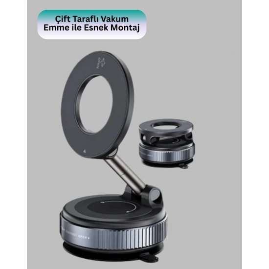 360 derece dönebilen manyetik araç telefon tutucu, sürüş sırasında telefon kullanımını güvenli ve konforlu hale getirir. Güçlü mıknatıs yapısı, cihazın sabit kalmasını sağlar ve titreşim kaynaklı hareketleri minimuma indirir. Bu özellik, özellikle bozuk zeminlerde ve uzun yolculuklarda büyük avantaj sağlar.Vakum emme sistemi, güçlü tutuş sağlayarak ürünü aracın camına veya ön paneline güvenle sabitler. Çift taraflı yapışma özelliği sayesinde montaj esnekliği sunar. Kullanıcı, ihtiyacına göre konumlandırma yapabilir.360 derece ayarlanabilir mekanizma, telefonunuzu ideal açıya getirmenizi sağlar. Navigasyon kullanımında göz hizasında görüntü elde edebilir, sürüş güvenliğini artırabilirsiniz. Dikey ve yatay kullanım seçenekleri, kullanım alışkanlıklarına uyum sağlar.Dayanıklı alüminyum alaşım gövde, uzun ömürlü kullanım sunar. Silikon kaplı temas noktaları, telefonun çizilmesini önler ve kaymaz bir yüzey oluşturur. Hafif yapısı sayesinde araç içinde ağırlık oluşturmaz.Geniş uyumluluğu sayesinde 4.7 inç ve üzeri tüm akıllı telefonlarla kullanılabilir. Kablosuz şarj destekli kılıflarla uyumlu olması, ürünü daha kullanışlı hale getirir.