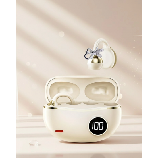 Bu kablosuz Bluetooth kulaklık, kulak klipsli yapısı sayesinde güvenli ve konforlu bir kullanım deneyimi sunar. Günlük hayatta, iş ortamında veya seyahatlerde rahatlıkla tercih edilebilir. Hafif ve kompakt yapısı, uzun süreli kullanımda bile rahatsızlık oluşturmaz.Uzun pil ömrü, yoğun tempolu kullanıcılar için büyük avantaj sağlar. Kristal netliğinde ses kalitesi, her aramayı daha anlaşılır ve verimli hale getirir. Şık ve zarif tasarımı sayesinde stilinizi tamamlayan modern bir aksesuar görevi görür.Set içeriğinde yer alan 2 adet kurdele küpe hediyesi, ürünü özel ve hediye edilebilir bir set haline getirir.