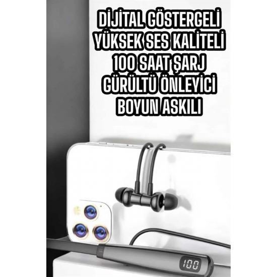 Mey İthalat® Boyun Askılı Bluetooth Kulaklık Uzun Şarj Süreli Dijital Göstergeli Kablolu
