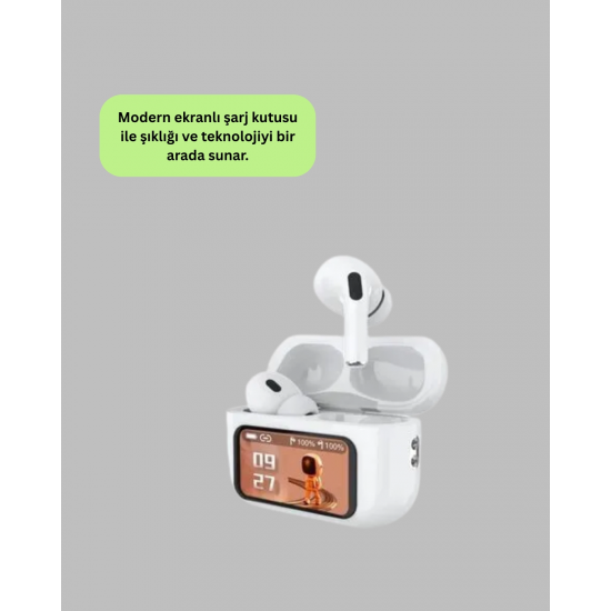 Bu dokunmatik kontrollü Bluetooth kulaklık, yüksek ses kalitesi ve gelişmiş kullanım kolaylığı ile her ortamda yanınızda olacak. Ergonomik kulak içi tasarımı sayesinde uzun süreli kullanımlarda bile rahat bir deneyim sunar. Dijital ekranlı şarj kutusu, hem kulaklıkların hem de kutunun pil seviyesini net bir şekilde göstererek şarj durumunu kolayca takip etmenizi sağlar. Güçlü bataryası sayesinde tek şarjla uzun saatler boyunca müzik dinleyebilir veya telefon görüşmesi yapabilirsiniz. Dokunmatik yüzey üzerinden şarkı geçişi, ses seviyesi ayarı ve arama yanıtlama gibi işlemleri hızlıca yapabilirsiniz. Aktif Gürültü Önleme (ANC) teknolojisi, dış ortam gürültüsünü en aza indirerek kesintisiz bir dinleme deneyimi sunar. Suya ve tere dayanıklı yapısı ile spor sırasında veya dış mekân aktivitelerinde güvenle kullanılabilir. Otomatik bağlantı özelliği, kulaklıkları kutusundan çıkardığınızda cihazınıza saniyeler içinde bağlanmasını sağlar. Kulakiçi sensörleri, kulaklığı çıkarıp taktığınızda müziği otomatik olarak durdurur veya devam ettirir. Dahili mikrofonu sayesinde net ses iletimi sunarak hem iş hem de sosyal yaşamda kesintisiz iletişim sağlar. Modern ve şık tasarımı ile günlük yaşamda hem fonksiyonel hem de estetik bir aksesuar olarak öne çıkar.