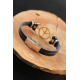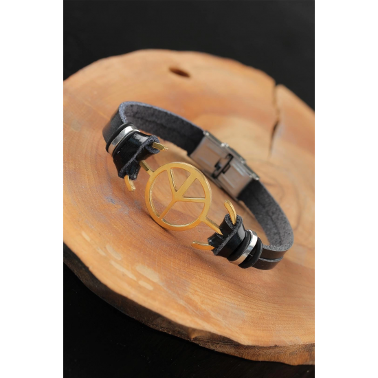 Mey İthalat® Gold Renk Barış Figürlü Metal Aksesuarlı Siyah Renk Deri Erkek Bileklik